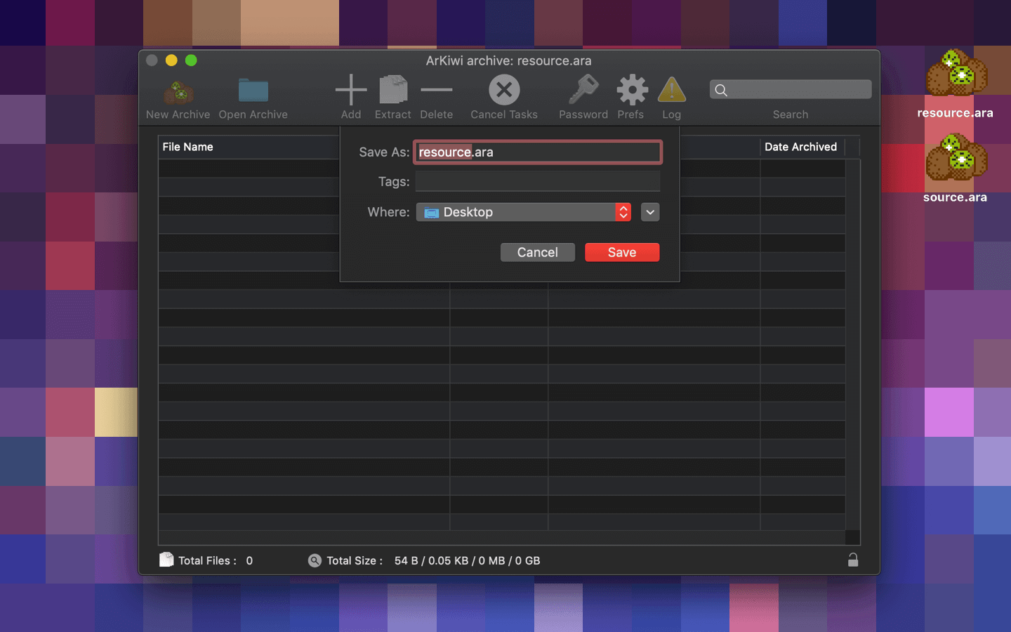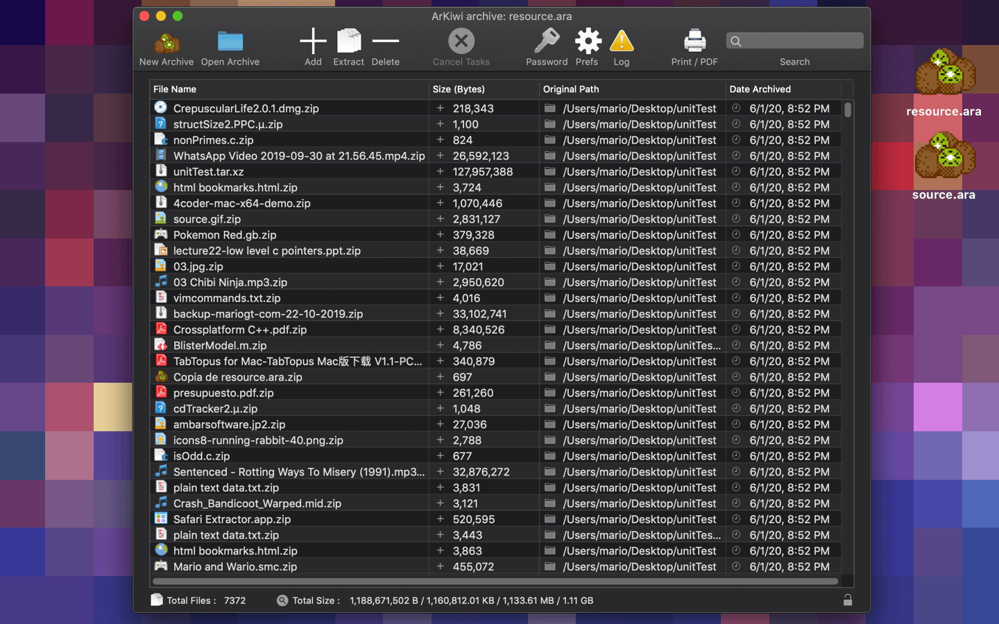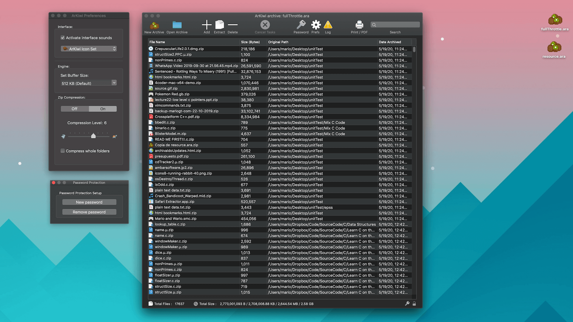 ArKiwi, is a blazing fast and optimized macOS file archiver App, where you can add, compress, extract, delete, password protect and search all your files, in a compact binary file system called ARA (ArKiwi Resource Archive). The ARA file is a file system with the capacity to accommodate theoretically unlimited numbers of files, of any size or type (jpg, gif, avi, mpg, ogg, mov, txt, mp3, mp3, acc, doc, iso, etc) only limited by the free space available in your SSD or other storage device. Also, you can add or remove files from your ArKiwi archive at any time, ArKiwi will contract or expand dynamically the archive depending on your needs.