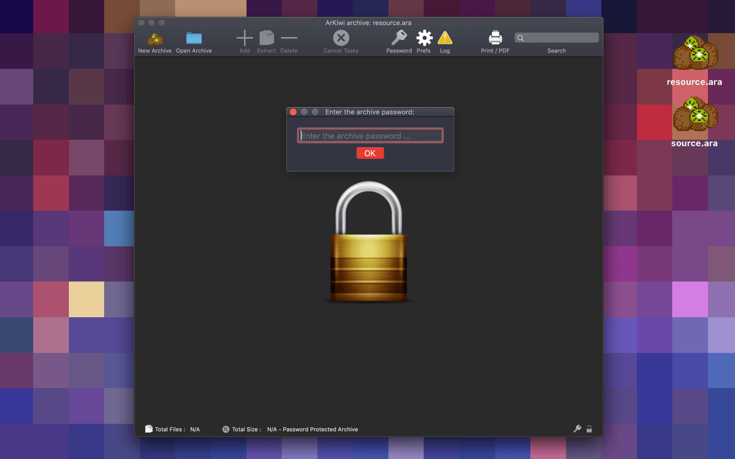 Using ArKiwi is very easy, you have a window with a table view where you can visualize the files archived, above of it you have a toolbar with operations that you can execute, like create a new ARA archive, open an existing ARA archive, add, extract & delete files from the archive, cancel the tasks queue (where for example you can stop a huge batch of tasks like adding & compressing thousands of files). Also, you can add password protection, see the log file, print the file list, etc. In the bottom of the ArKiwi window, you can find useful info like the number of files archived, the data total size (in bytes, kilobytes, megabytes, and gigabytes), and in the right lower corner, a tiny padlock icon that shows if the ARA file is editable or not (locked /unlocked). Also, if your ARA archive is password protected a little silver key icon will appear near the padlock icon.