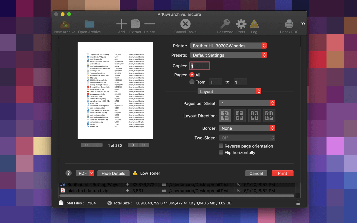 ArKiwi can print or save in PDF the list of archived files in your ARA. Just select "Print/PDF" from the "File" menu, or add the "Print/PDF" item to the ArKiwi Toolbar, for easy access to this functionality.