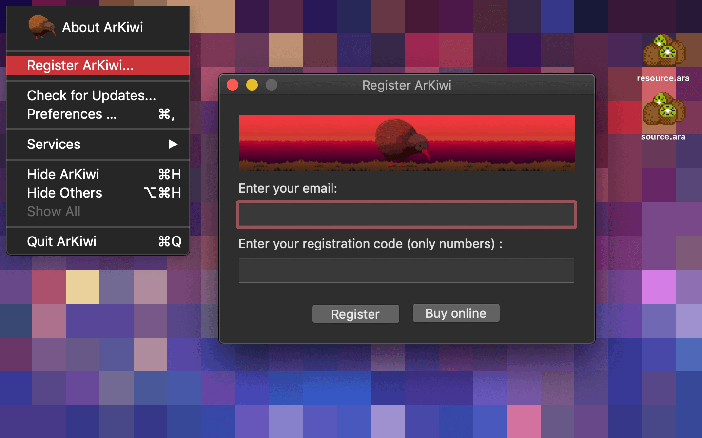 You can register ArKiwi at any time, you only have to select "Register ArKiwi…" from the main menu and click on the button "Buy online" (or directly from this WebPage) then you will be redirected to this website where you can complete the purchase. After the payment is made I will send you the registration code, generated automatically from your email address. Finally, put your email and registration code in the respective text fields on the ArKiwi registration window, click on the "Register" button and that is all, your software will be registered !!