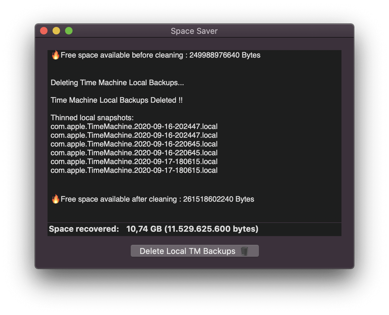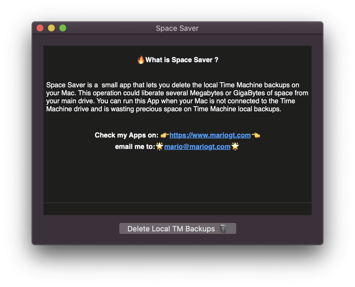 Space Saver is a handy macOS App (Universal Intel/Apple Silicon native), that lets you delete the local Time Machine Backups on your Mac. This operation could liberate several Megabytes or GigaBytes of space from your main drive. You can run this App when your Mac is not connected to the Time Machine drive and is wasting precious space on Time Machine local backups.