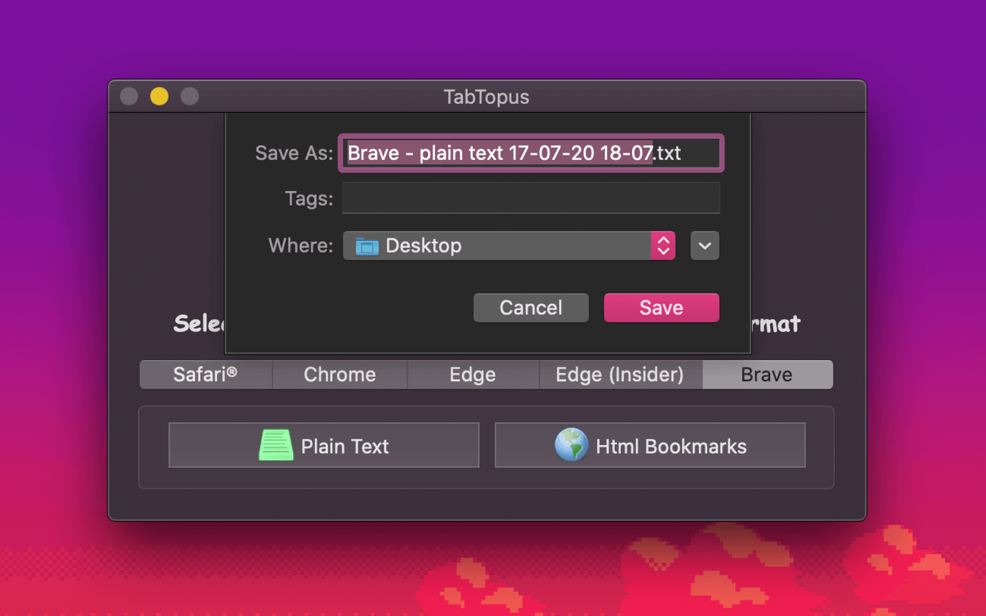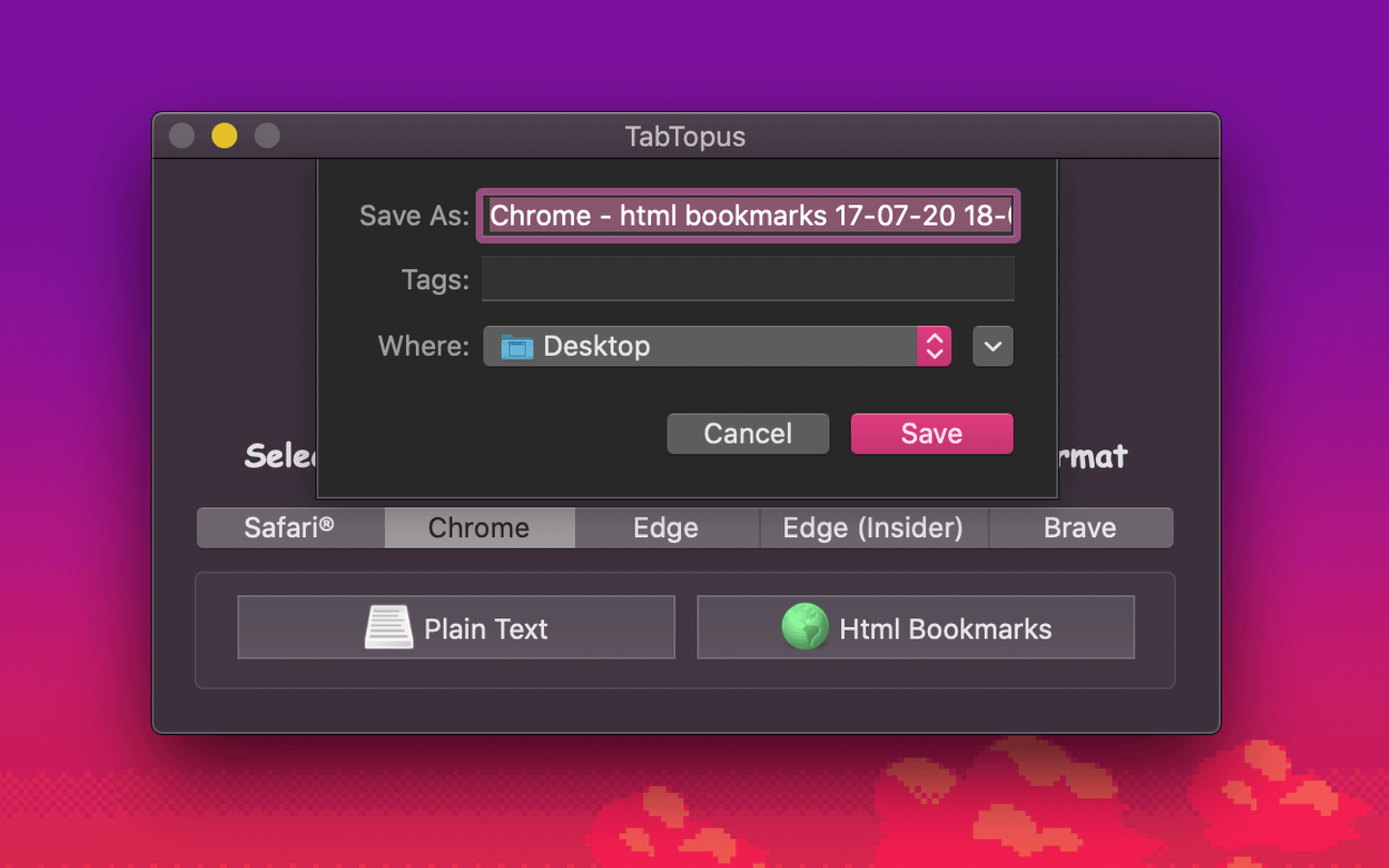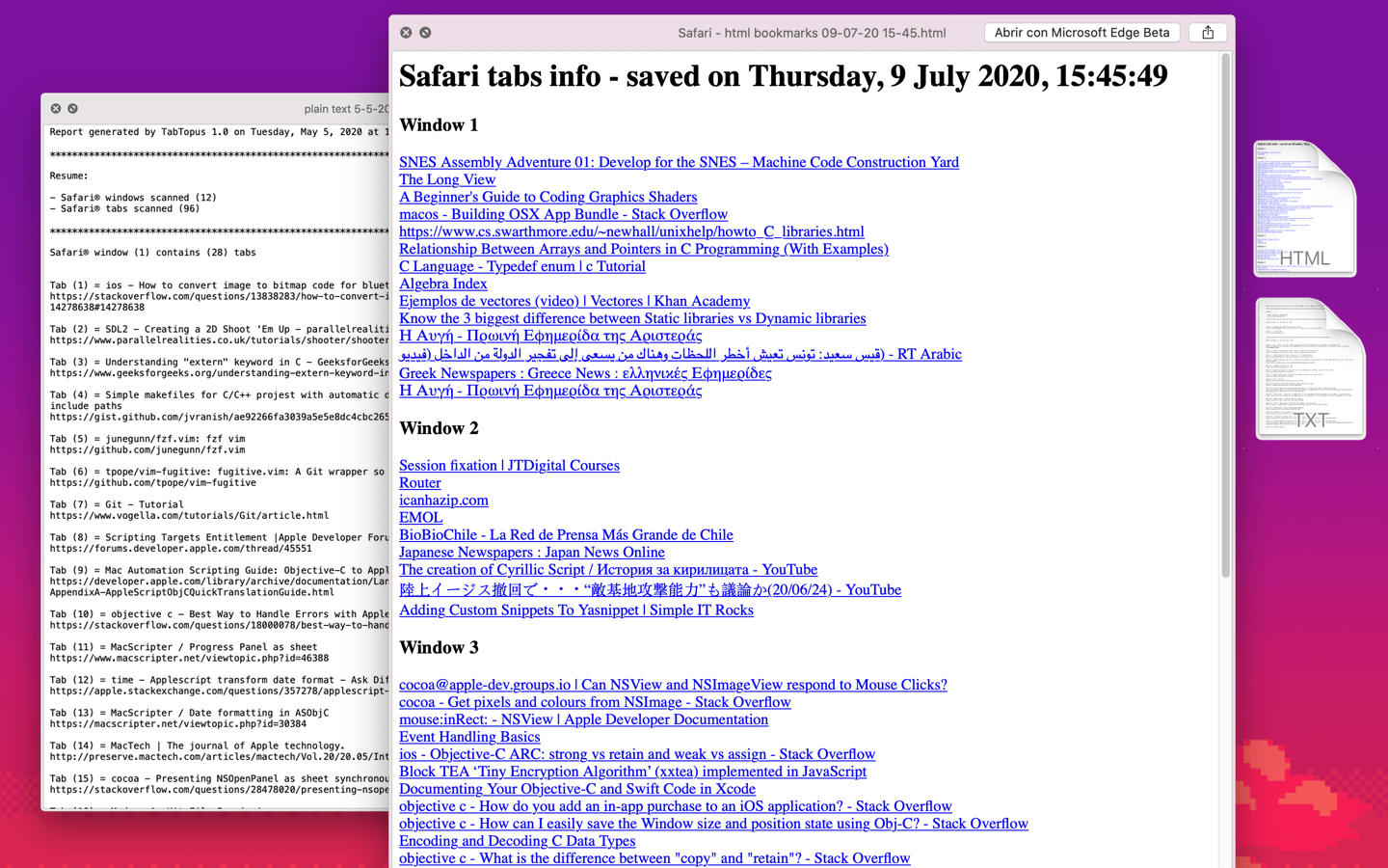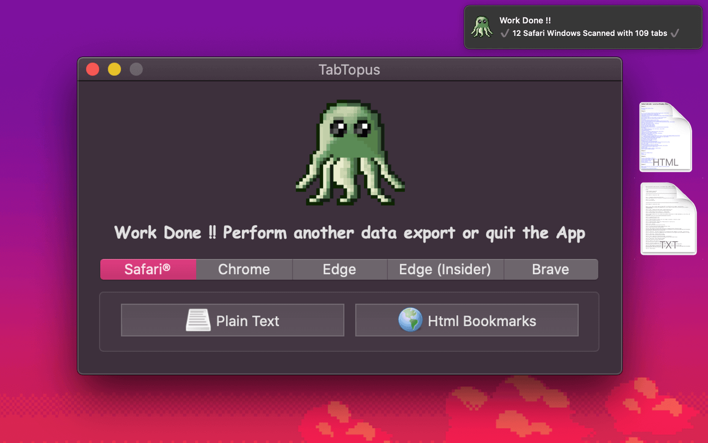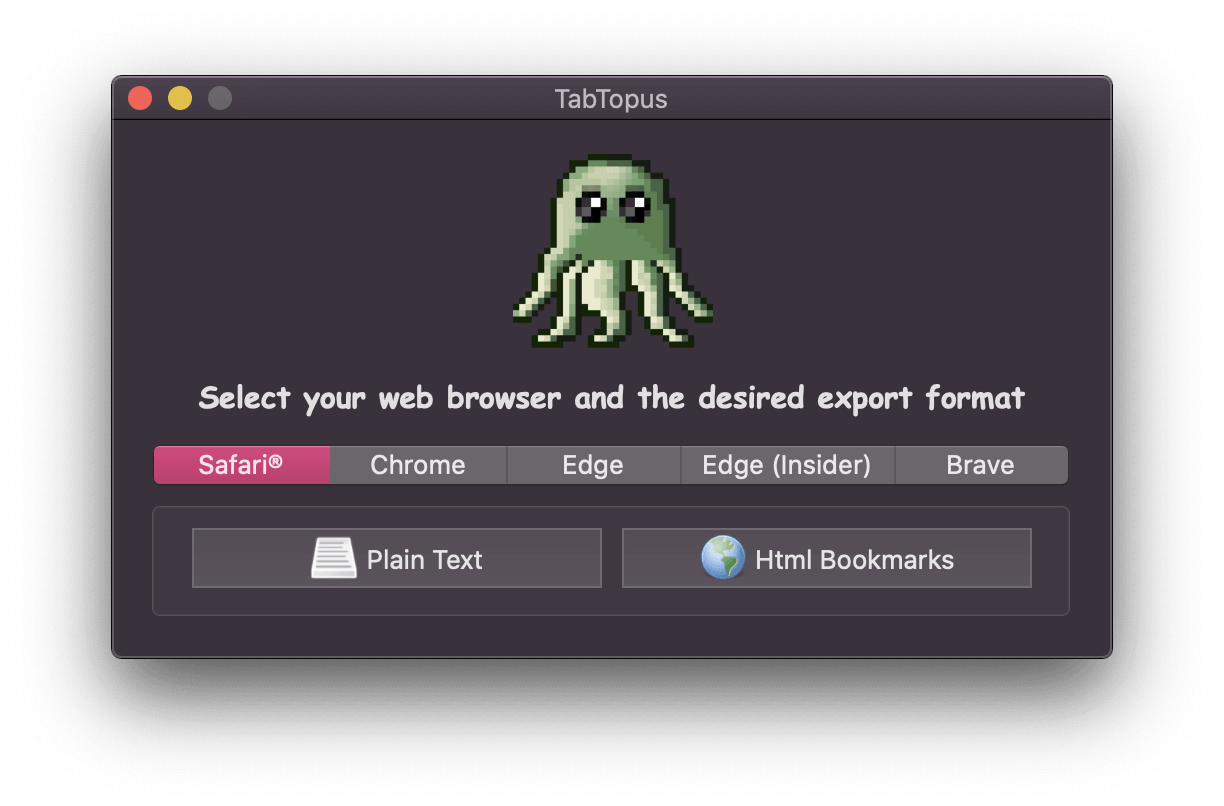 TabTopus is an useful and lightweight macOS App (optimized for Apple Silicon and Intel CPUs), that lets you export the names and URLs of all your tabs actives, either in Apple Safari, Google Chrome, Microsoft Edge, Microsoft Edge Insider/Beta, or Brave Browser. This implies that all your browser windows and tabs will be scanned to extract this info. You can save the data to either a plain text file or to an HTML bookmarks document, ready for archiving, sharing with a friend, a colleague, or simply for saving your current tabs info for later use.